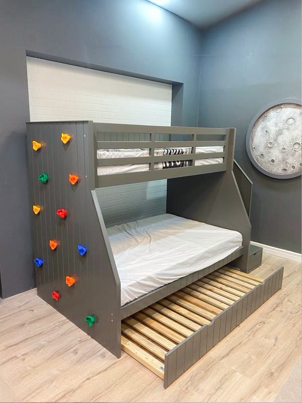 This gray bunk bed combines sleek design with practical functionality, perfect for maximizing space without sacrificing style. Crafted with sturdy materials, it offers reliable support for restful sleep and easy access with its integrated ladder. Ideal for shared bedrooms or guest rooms, it blends seamlessly into sophisticated interiors, adding a modern yet timeless touch to your space.
