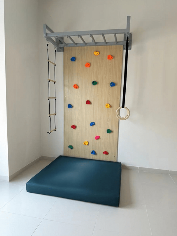 Kids Indoor Climbing Wall Set with monkey bars, rope ladder, and gym rings—perfect for active play and motor skill development. Made with a sturdy wood panel and vibrant climbing grips. Includes a padded safety mat for added protection.