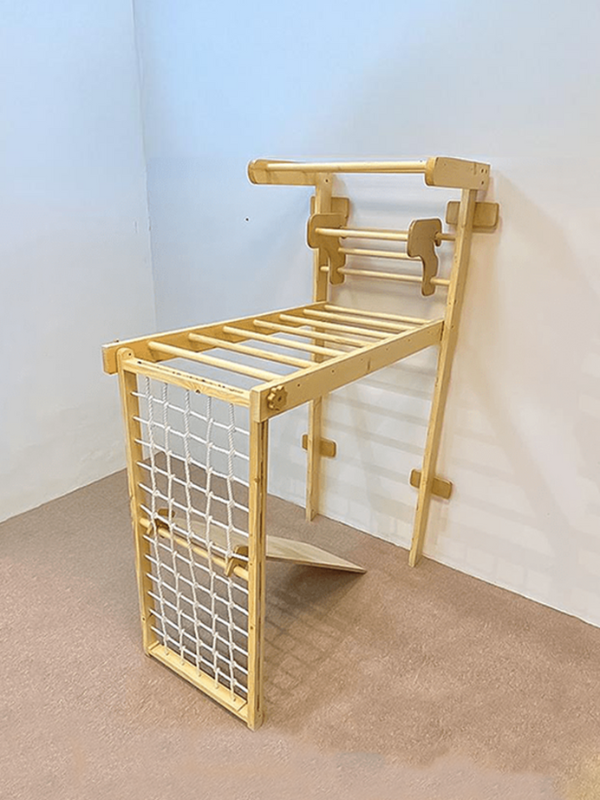 Compact wall-mounted Montessori climbing gym with ladder, rope net, and bars for active play. Ideal for kids' indoor fitness and motor skill development. Crafted in natural wood finish.